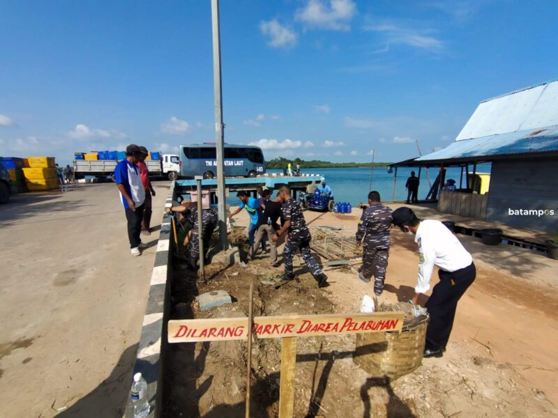 batampos- Jajaran personil TNI Al di Pos Angkatan Laut Pelabuhan Sagulung gelar bakti sosial bersih-bersih lingkungan pelabuhan, Minggu (27/3) pagi. Baksos dalam rangka menyambut bulan Ramadan ini melibatkan masyarakat dan penambang pancung boat setempat serta instansi kemaritiman lainnya yang bertugas di sana.