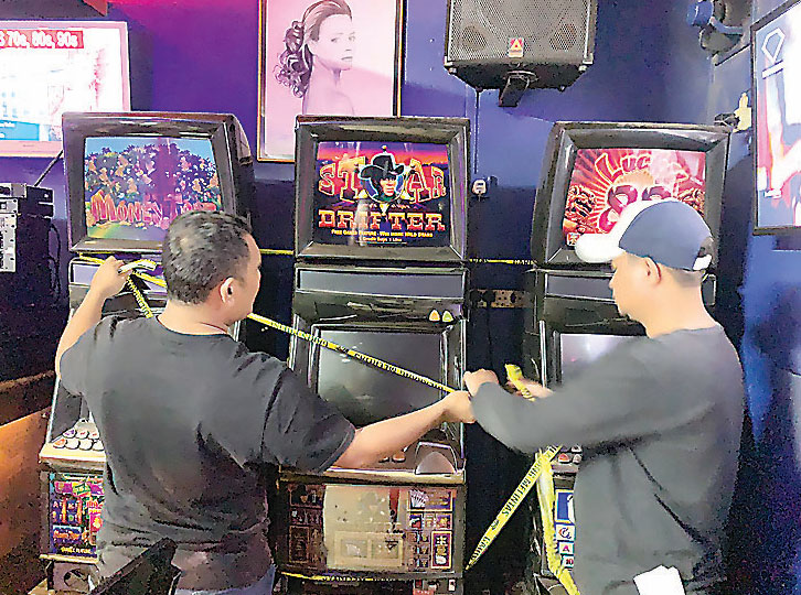 Polisi menyegel mesin slot yang dipakai untuk perjudian di New Sugar Bar di Kompleks Ruko Inti Sakti, Batuampar.