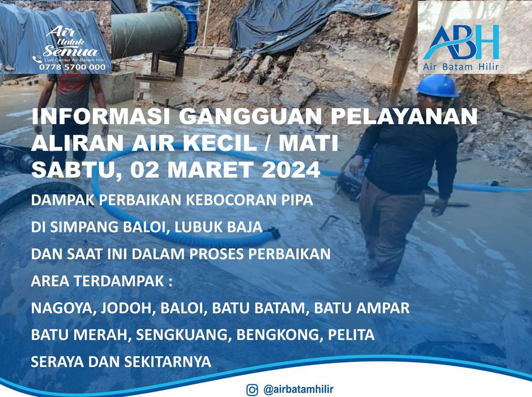 Pembaca Batam Pos, PT Air Batam Hilir, ada perbaikan kebocoran pipa 600mm di Simpang Baloi, Lubuk Baja. Sebab perbaikan masih dalam proses makan ada potensi gangguan pelayanan suplai air bersih berupa air kecil dan air terhenti untuk sementara waktu.