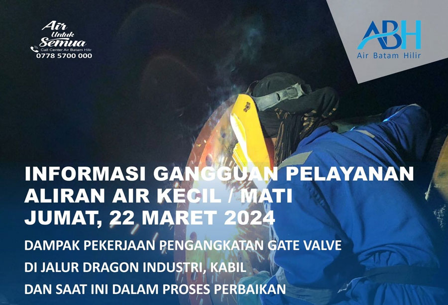 PT Air Batam Hilir menginformasikan dampak perbaikan tersebut akan berdampak pada gangguan pelayanan suplai air bersih berupa air kecil dan air terhenti untuk sementara waktu.