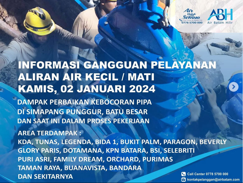 batampos – PT Air Batam Hilir, operator air bersih di Batam menginformasikan bahwa ada perbaikan kebocoran pipa DN 800mm di Simpang Punggur, Batu Besar.