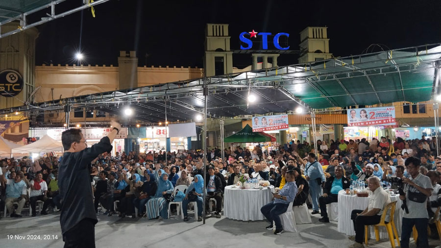 batampos –  Calon Walikota Batam nomor urut 2, Amsakar Achmad nonton bareng pertandingan Indonesia vs Arab Saudi Kualifikasi Piala Dunia 2026 Zona Asia bersama masyarakat di STC Sekupang, Kota Batam, pada Selasa (19/11) malam.