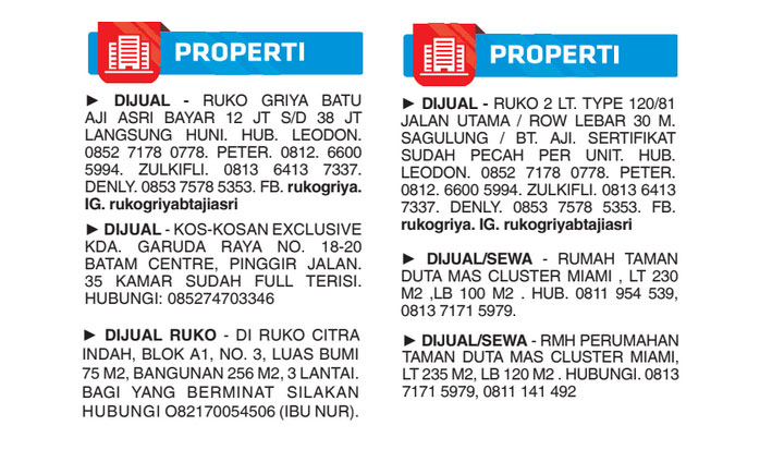 Mikro Bisnis Aneka Kebutuhan Properti Ada di Sini Editor: Putut ATP Selasa, 4 Jul 2023 - 14:23 WIB Bagikan WhatsAppTelegramLINEFacebookTwitter Berita Terkait Kawasan Komersial dengan Fasilitas Ikonik, Tana Group Pasarkan Perumahan Konsep Urban Info Kota Minggu, 3 Agu 2025 - 14:12 WIB Tana Group Gandeng AREBI Pasarkan AURUM, Urban Hub 24/7 Pertama di Batam Info Kota Minggu, 3 Agu 2025 - 13:11 WIB Tana Group Resmikan Aurum Lounge di One Batam Mall Info Kota Rabu, 11 Jun 2025 - 15:07 WIB Iklan terbit di harian Batam Pos edisi 4/7/2023. Bagikan WhatsAppTelegramLINEFacebookTwitter SALAM RAMADAN Bukber Seru di Batam! 5 Cafe Nyaman dan Harga Bersahabat untuk Buka Puasa Ramadan Rabu, 18 Feb 2026 - 17:03 WIB HARRIS Barelang Batam Hadirkan Paket Menginap 24 Jam Termasuk Iftar Ramadan 2026 Rabu, 18 Feb 2026 - 15:03 WIB Buka Puasa Bersama Ramadan Bernuansa Mediterranean di Montigo Resorts Nongsa Senin, 16 Feb 2026 - 16:32 WIB