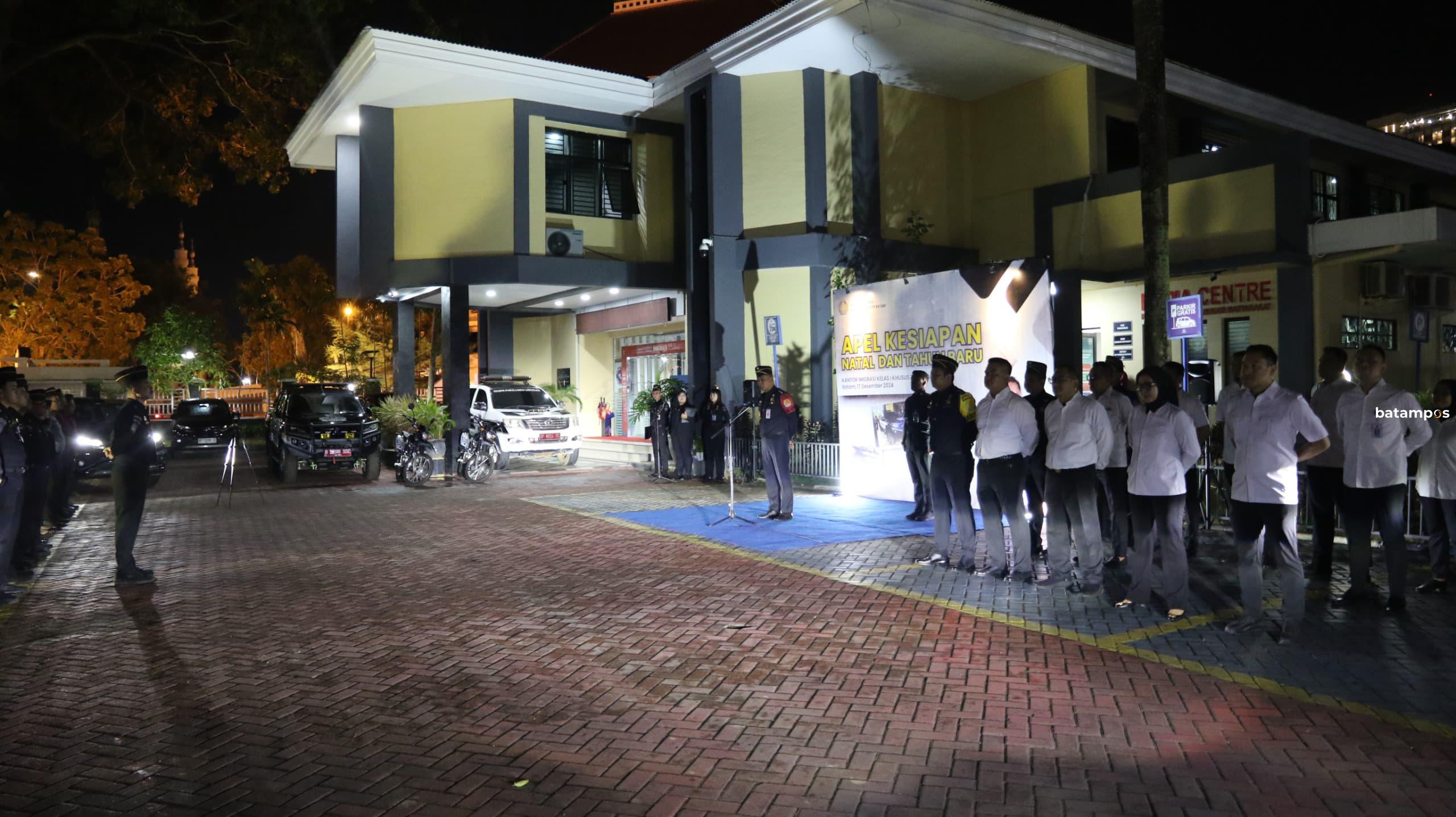 batampos – Kantor Imigrasi Kelas I Khusus TPI Batam menggelar apel kesiapan menghadapi momen Natal 2024 dan Tahun Baru 2025, Selasa (17/12) pagi, di lapangan Kantor Imigrasi. Apel yang berlangsung pukul 05.00 WIB ini dipimpin langsung oleh Kepala Kantor Imigrasi, Hajar Aswad, yang bertugas sebagai pembina apel.