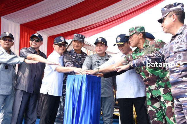 penekanan tombol sirine sebagai tanda dimulainya pemasangan tiang pancang pembangunan Dermaga Bakamla di Setokok Batam, Kamis (13/4/2023). Foto: Bakamla RI untuk Batam Pos
