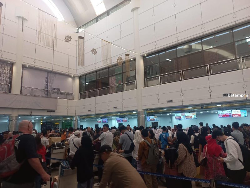 batampos – Puncak arus balik masih berlangsung hingga, Sabtu (29/4). Antrean calon penumpang check in mengular di Bandara Hang Nadim Batam. Antrean ini terjadi karena adanya peningkatan arus penumpang di Bandara Hang Nadim Batam.