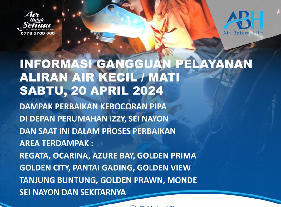 batampos – PT Air Batam Hilir menginformasikan tengah melakukan perbaikan kebocoran pipa di Depan Perumahan Izzy, Sei Nayon. “Saat ini perbaikan masih dalam proses,” ujar Ginda, Humas PT Air Batam Hilir.