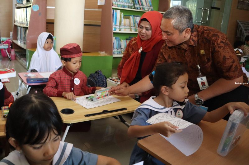 Bunda Pendidikan Anak Usia Dini (PAUD) Provinsi Kepri Dewi Kumalasari Ansar (kiri) bersama Kepala Dinas Perpustakaan dan Kearsipan Provinsi Kepri, Herry meninjau murid-murid PAUD yang mengikuti lomba mewarnai di kantor UPT Perpustakaan Muhamad Sani di komplek Perumahan KDA Batam, Kamis (14/9). F Cecep Mulyana/Batam Pos