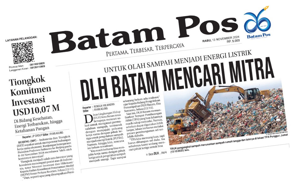 ”Kita masih berharap bisa menjalin kerja sama dengan pihak ketiga untuk pengolahan sampah menjadi energi. Tapi sampai sekarang belum ada realisasi,” ujar Kepala Bidang Pengelolaan Persampahan DLH Batam, Eka Suryanto, Selasa (12/11).