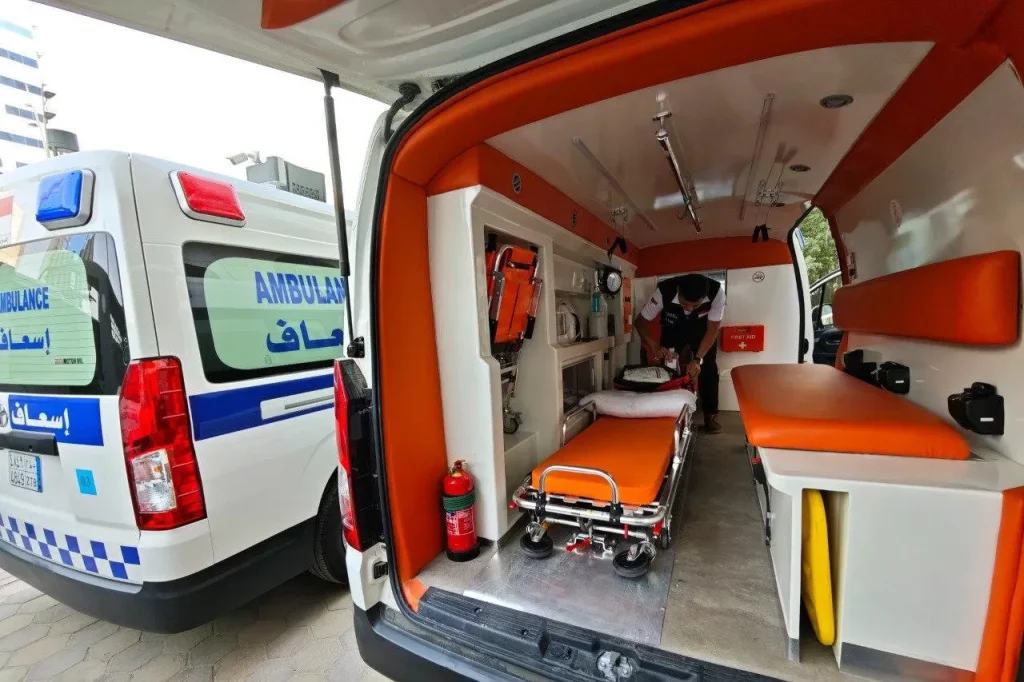 Petugas kesehatan haji sedang memeriksa ambulance yang digunakan untuk operasional di Daker Madinah. (Andika/MCH 2025)
