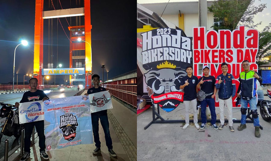 Kegiatan touring menuju lokasi acara di awali dari pelepasan para bikers dari Main Dealer PT Capella Dinamik Nusantara Kepri kemudian menuju pelabuhan punggur sesampainya dipelabuhan punggur para bikers menuju pelabuhan kuala tungkal dengan menaiki kapal yang memakan waktu 13 jam untuk sampai di pelabuhan kuala tungkal. Kemudian dilanjutkan menuju kota Jambi dan melanjutkan perjalanan ke ke kota Palembang sesampainya di palembang para bikers bermalam bertemu dengan sedulur bikers Palembang sembari memperbaiki mootor bikers yang sedeng trouble para biker One Heart Community Kepri diajak berfoto di jembatan Ampera yang menjadi icon kota Palembang, kemudian di pagi hari para bikers melanjutkan perjalanan menuju kota Bandar Lampung yang menjadi lokasi acara Honda Bikers Day Regional Sumatera 2023.