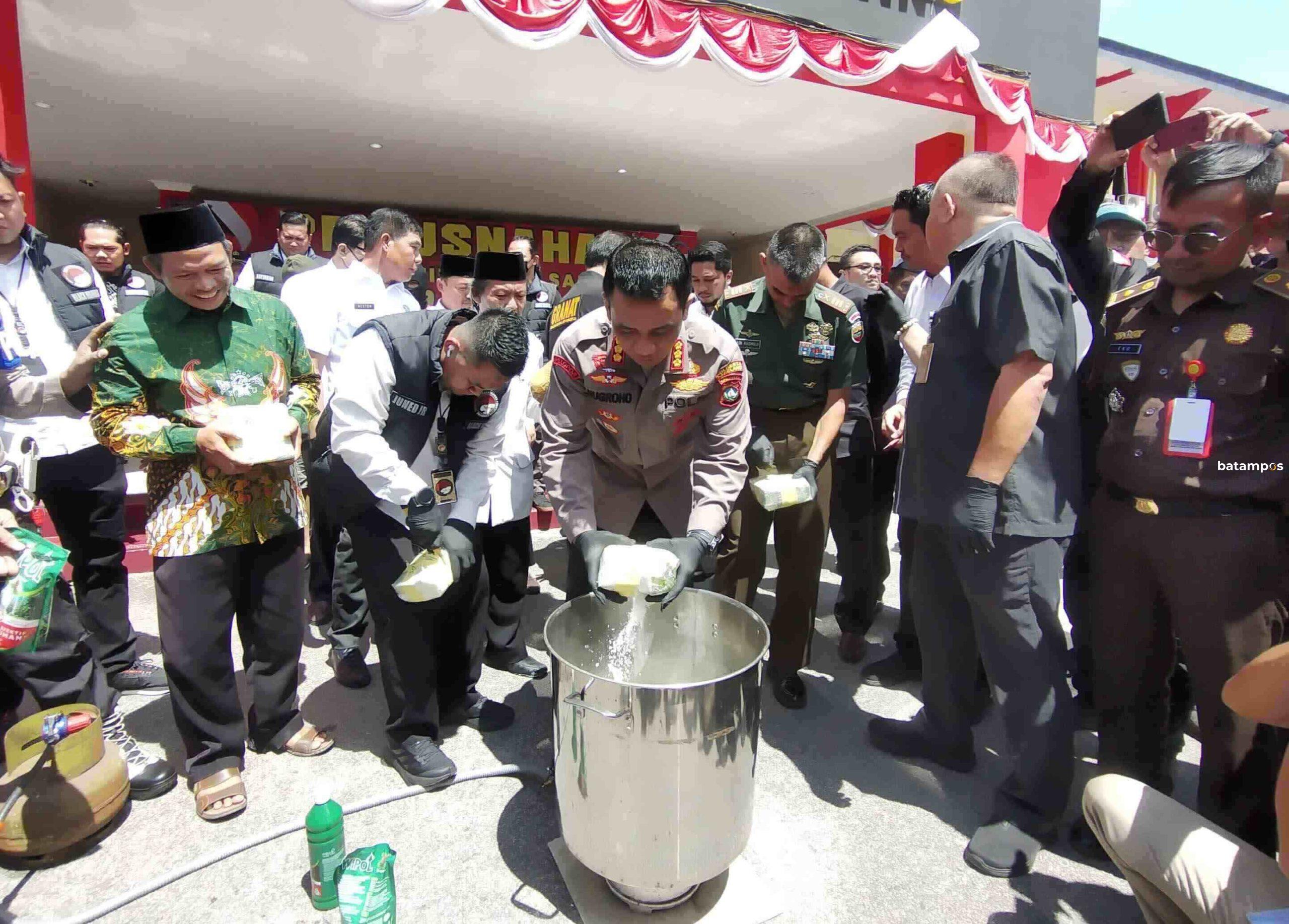 Kaplresta Barelang Kombes Nugroho memusnahkan tangkapan sabu di halaman Mapolresta Barelang, Rabu (9/8). Foto Dalil Harahap/batam Pos.