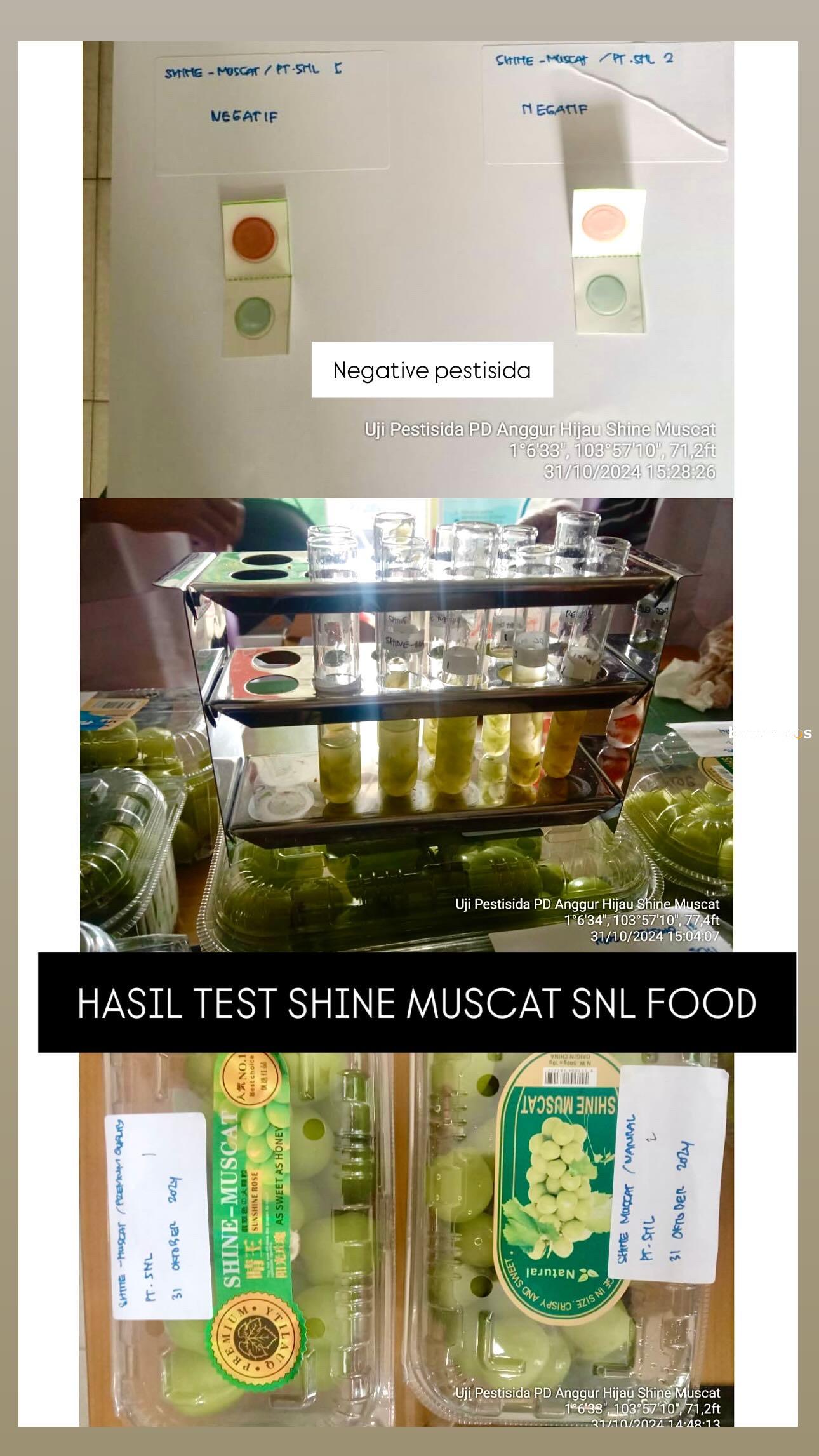 Dina Handayani dari Dinas Ketahanan Pangan dan Pertanian bersama timnya mengunjungi SNL Food pada Kamis (31/10) lalu untuk menguji produk anggur Shine Muscat yang dijual di SNL Food. Hasil uji lab rapid test tersebut menunjukkan bahwa produk ini negatif residu pestisida (carbamat dan organophosphate).