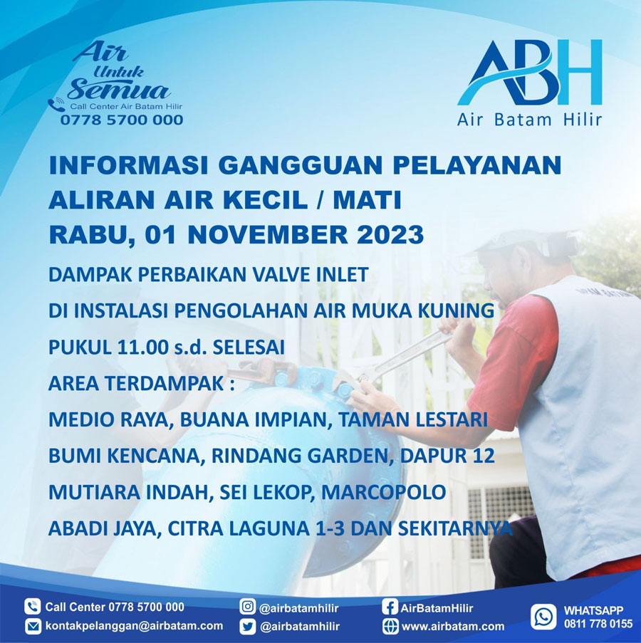 Air Batam Hilir menginformasikan adanya pekerjaan perbaikan Valve Inlet di Instalasi Pengolahan Air Muka Kuning yang akan dilakukan pada :
