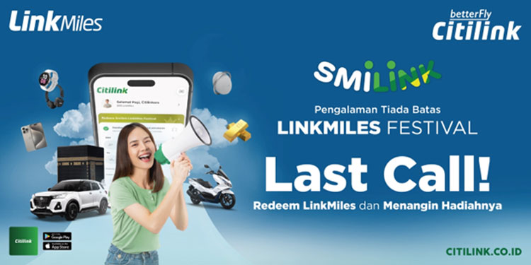 Masih banyak spot-spot seru yang hanya bisa kamu kunjungi untuk liburan akhir tahun sekaligus malam tahun baruan. Yuk tutup 2024-mu lebih spesial bersama orang-orang tersayangmu dan Citilink! Sambil menunggu jadwal terbang, yuk tukarkan miles-mu sekarang dan menangkan hadiah undian Smilink LinkMiles Festival dari Citilink karena batas periode penukaran miles hanya sampai 17 November 2024. Bagi kamu yang sudah redeem, jangan lupa untuk simpan kode unik voucernya sampai pengumuman pemenang nanti pada tanggal 30 November 2024. Untuk informasi lebih lanjut, klik di sini