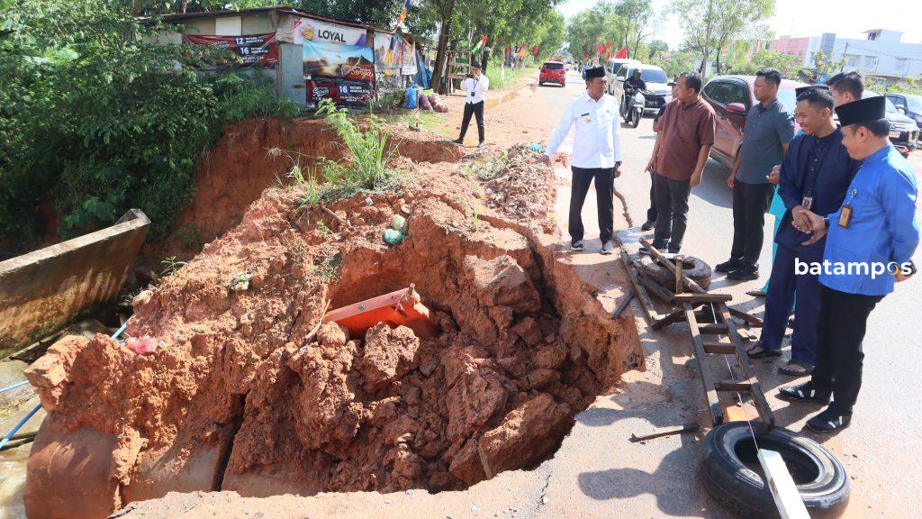 Pjs Walikota Batam Andi Agung meninjau jalan amblas di Jalan Dang Merdu Batubesar, Kecamatan Nongsa, Jumat (11/10). F Cecep Mulyana/Batam Pos