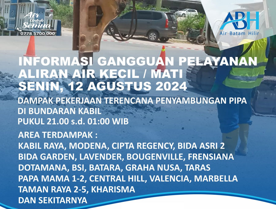 PT. Air Batam Hilir menginformasikan ada rencana penyambungan pipa DN 300mm di Bundaran Kabil.