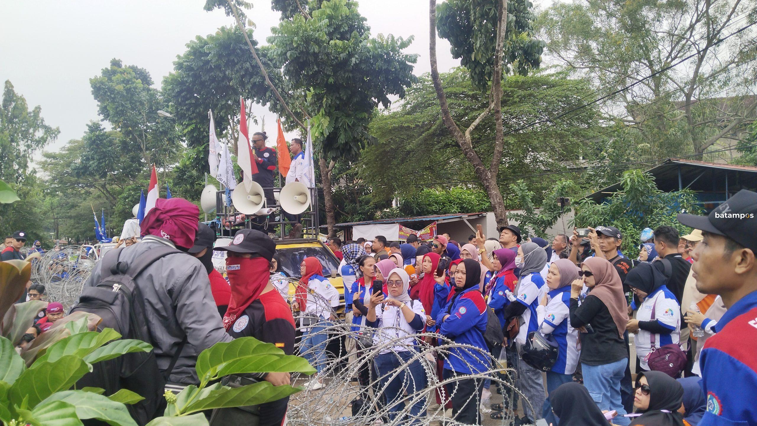 Ratusan buruh yang tergabung dalam Koalisi Rakyat Batam (KRB) menggelar aksi unjuk rasa di Kantor Dinas Tenaga Kerja (Disnaker) Kota Batam, Kamis (12/12).