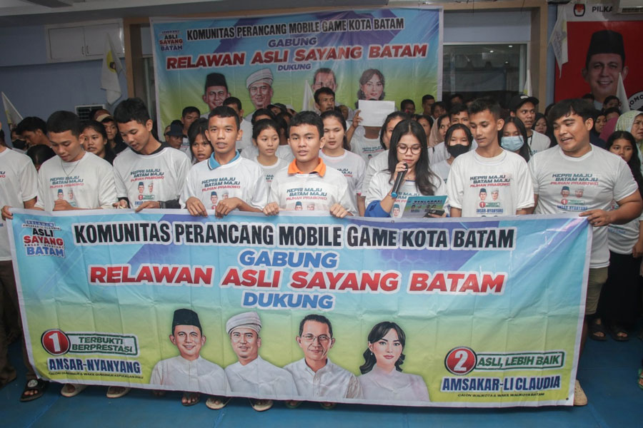 “Dengan menyebut nama Allah SWT, kami Komunitas Perancang Mobile Game Kota Batam menyatakan bergabung bersama Relawan Asli Sayang Batam untuk mendukung penuh Ansar-Nyanyang sebagai Calon Gubernur dan Wakil Gubernur Kepulauan Riau sekaligus Amsakar-Li Claudia sebagai Calon Wali Kota dan Wakil Wali Kota Batam,” ujar Ketua Komunitas Perancang Mobile Game Kota Batam, Rachel Octavia Siregar.