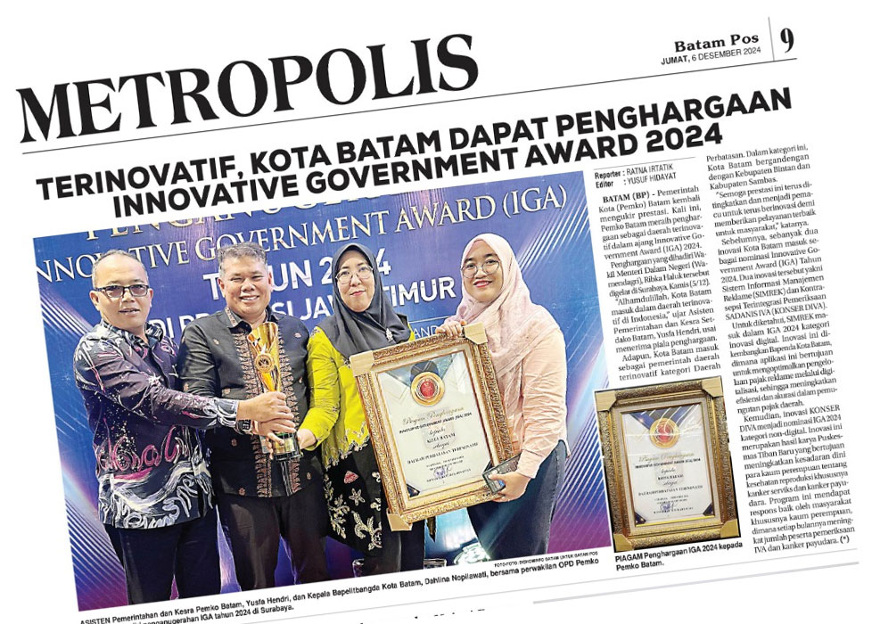 Sebelumnya, sebanyak dua inovasi Kota Batam masuk sebagai nominasi Innovative Government Award (IGA) Tahun 2024. Dua inovasi tersebut yakni Sistem Informasi Manajemen Reklame (SIMREK) dan Kontrasepsi Terintegrasi Pemeriksaan SADANIS IVA (KONSER DIVA).
