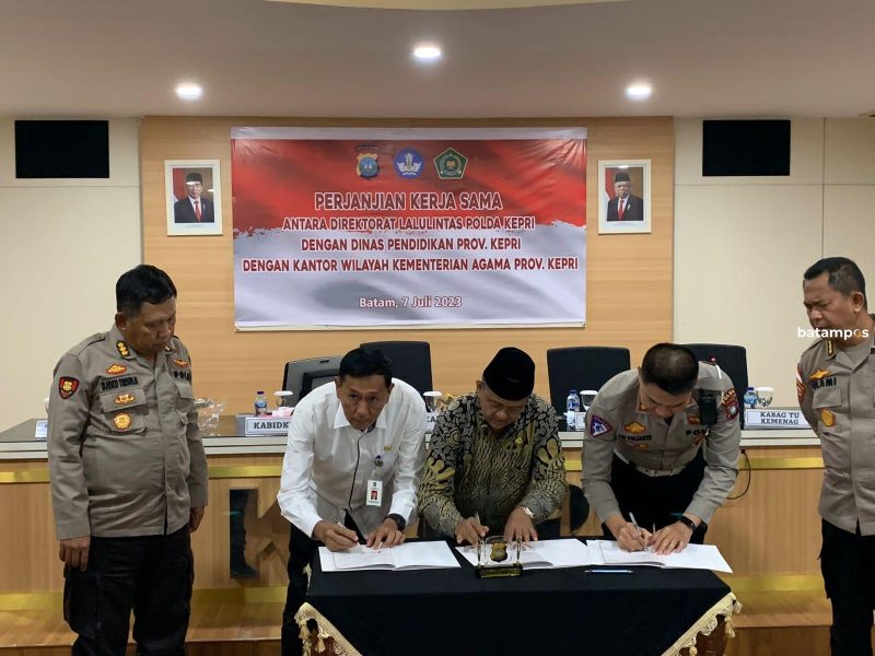 batampos – Direktorat Lalu Lintas (Ditlantas) Polda Kepri, bersama Dinas Pendidikan, dan Kantor Wilayah Kementerian Agama Provinsi Kepri, melakukan perjanjian kerja sama terkait integrasi Pelajaran Lalu Lintas yang akan menjadi kurikulum di setiap tingkat Sekolah Menengah Atas (SMA) di Kepulauan Riau, Jumat (7/7).