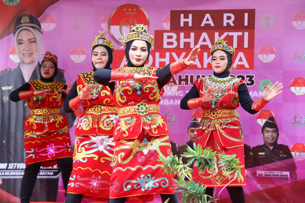 Kepala Kajari Batam Herlina Setyorini bersama Ketua dan anggota Ikatan Adhyaksa Dharmakarini (IAD) Kejari Batam, menjadi pembuka lomba tarian kreasi Tobelo. Gerakan lincah dan semangat kaum ibu-ibu itu berhasil mendapatkan pujian dari para penonton.