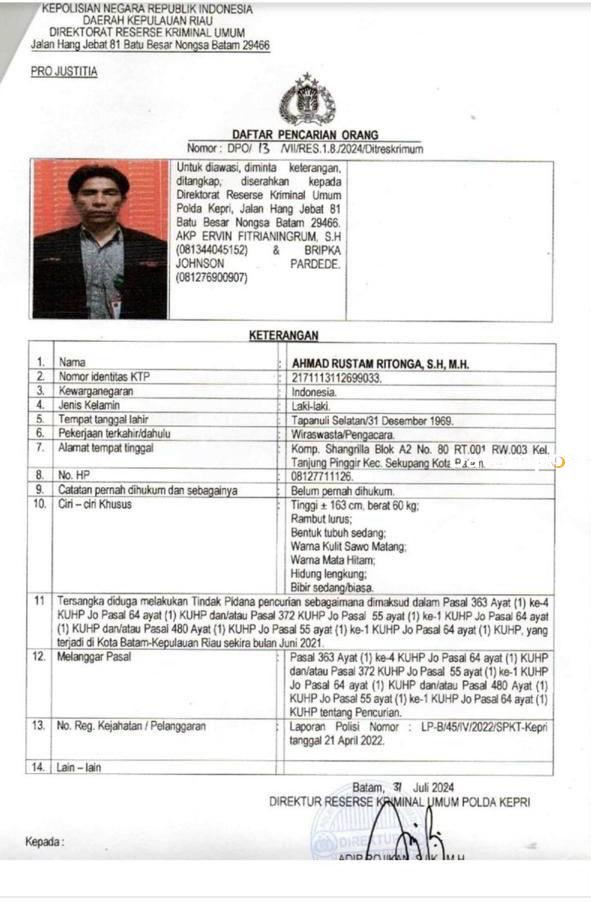 batampos – Ditreskrimum Polda Kepri menerbitkan surat daftar pencarian orang (DPO) atas nama Ahmad Rustam Ritonga. Pria yang berprofesi sebagai pengacara ini terjerat kasus pencurian uang dan ditetapkan tersangka pada bulan lalu.