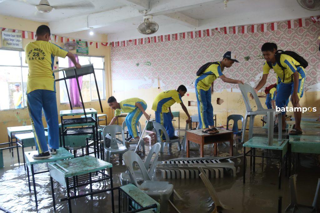 Pantauan Batam Pos, para siswa terlihat antusias dan penuh semangat meskipun harus membersihkan lumpur dan kotoran yang tersisa. Mereka saling membantu, bahkan sesekali bercanda di tengah proses pembersihan.