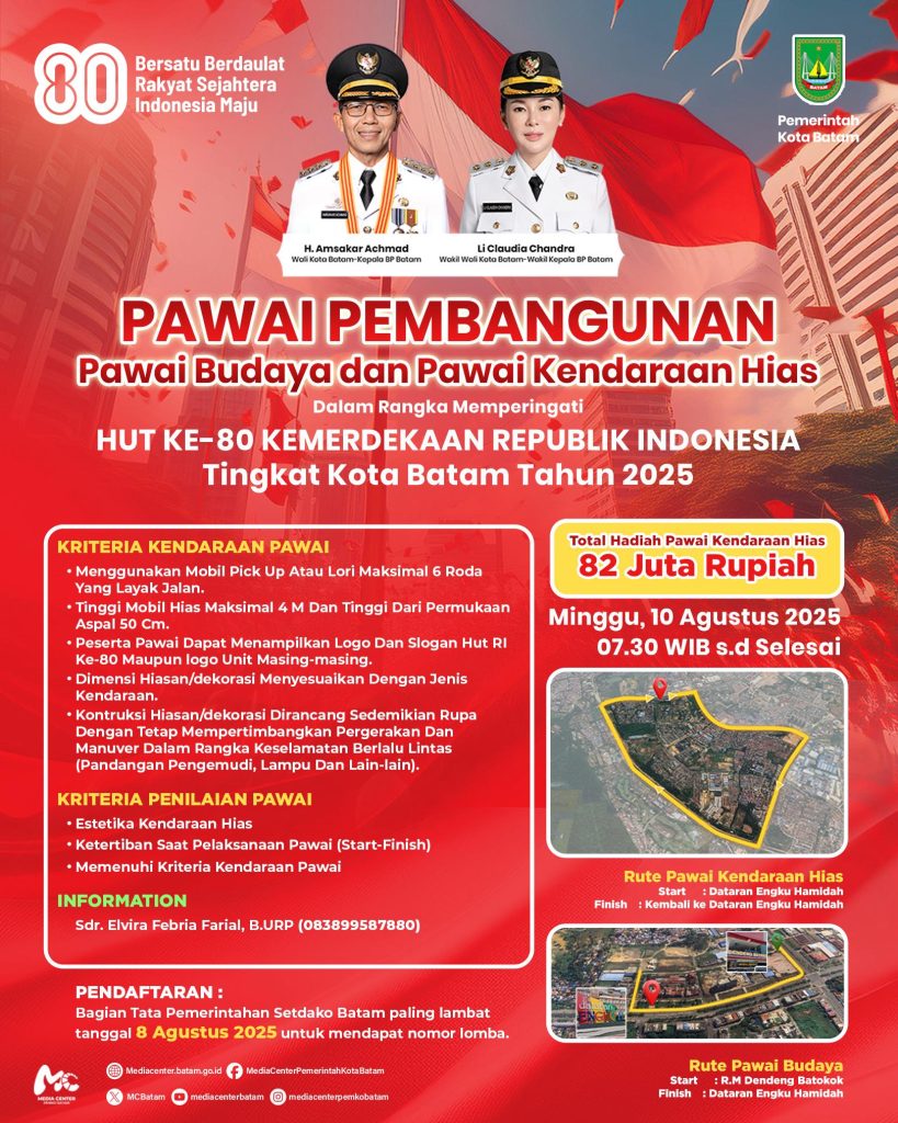 Rudi mengajak seluruh masyarakat Batam untuk hadir dan berpartisipasi dalam kegiatan ini. “Mari bersama kita semarakkan Hari Kemerdekaan dengan semangat persatuan dan rasa cinta tanah air melalui Pawai Pembangunan 2025,” tambahnya. (*)