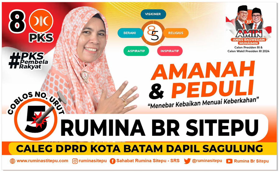 Dalam Pemilu 2024, Rumina Sitepu adalah solusi tepat yang konsisten dengan nilai-nilai yang dijunjung tinggi oleh warga Sagulung: religius, inspiratif, aspiratif, visioner, dan berani. Caleg PKS Rumina Sitepu berkomitmen untuk mewujudkan perubahan yang diinginkan oleh warga Masyarakat Sagulung, Kota Batam.