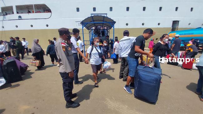 batampos – Sebanyak 1.008 orang tiba di Batam dengan menggunakan KM Kelud yang bersandar di Pelabuhan Batuampar, Rabu (16/11/2022). Kedatangan para penumpang tersebut mendapatkan pengamanan dari personel Polsek Kawasan Pelabuhan Batam dan instansi terkait.