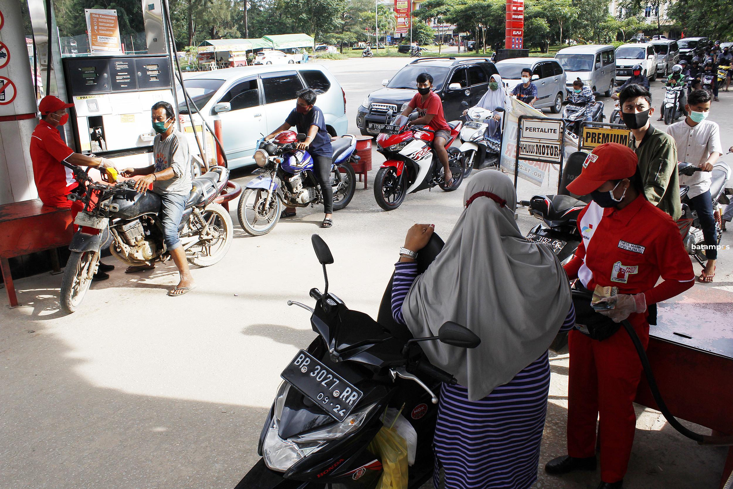 Pengendara roda dua dan roda empat antre saat mengisi BBM di SPBU Tiban, Foto. Iman Wachyudi/ Batam Pos