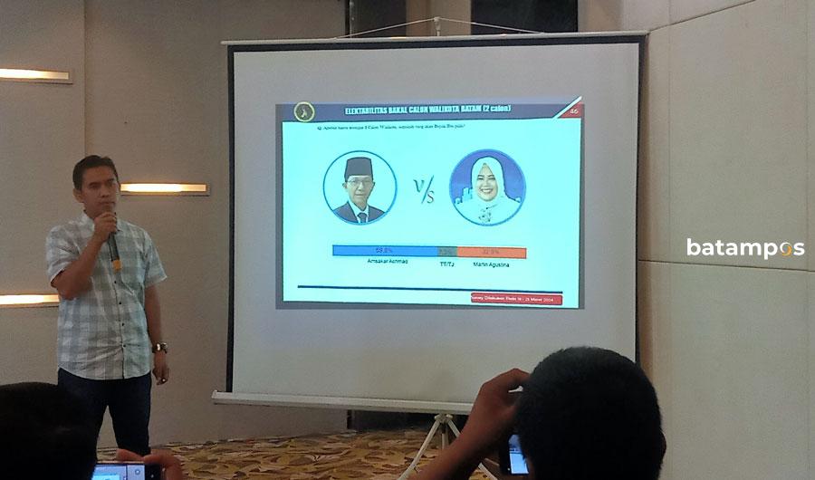 Direktur Eksekutif Liberte Institute, Dr Indrayadi M.Si mengatakan Amsakar dengan posisi 59 persen dan Marlin 31 persen. Survey ini dilihat dari 1.200 responden yang dilaksanakan dari 16 Maret hingga 25 Maret di Kota Batam.