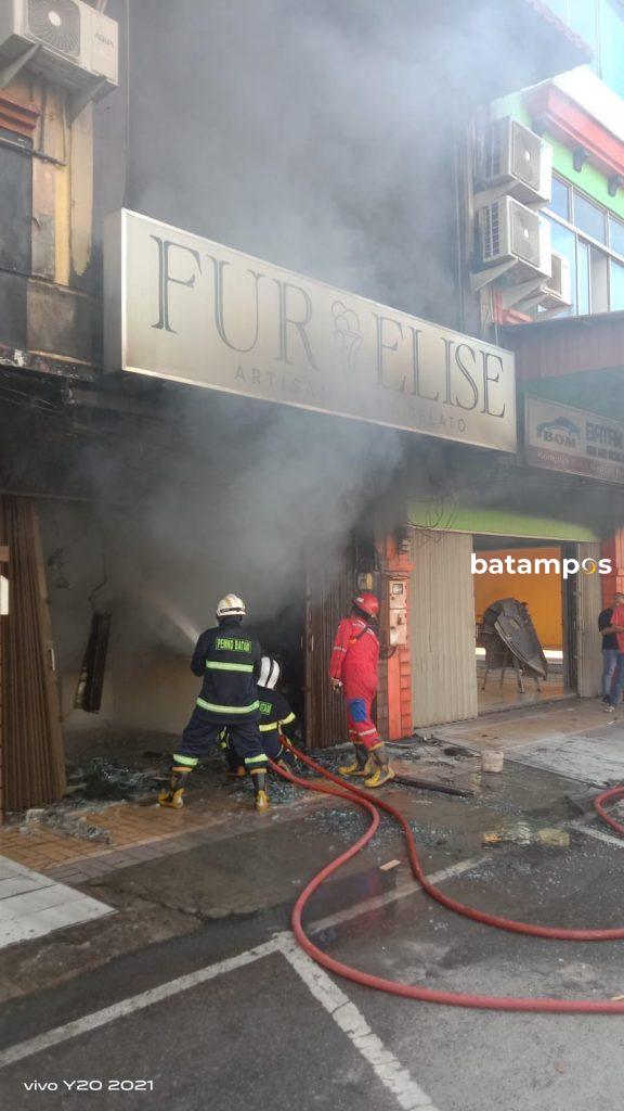 batampos – Toko es krim Four Elise Artisan Tea & Gelato di Ruko kawasan Nagoya Newtown, Lubuk Baja terbakar, Rabu (16/7) pagi. Tak ada korban jiwa dalam kejadian ini, namun api menghanguskan seluruh isi toko.