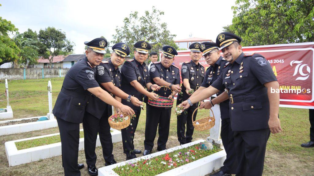 batampos – Pejabat dan pegawai di lingkungan kerja Kantor Wilayah Kementerian Hukum dan HAM RI (Kanwil Kemenkumham) Kepri lakukan ziarah dan tabur bunga ke Taman Makam Pahlawan (TMP) Bulan Gebang Batam di Batuaji, Jumat (9/8) .