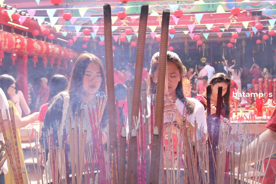 batampos – Momen tahun baru Cina 2575 dimanfaatkan warga Tionghoa untuk sembahyang, seperti yang terlihat di Maha Vihara Duta Maitreya, Kota Batam, Sabtu (10/2). Warga Tionghoa ramai memadati vihara sejak pagi, untuk beribadah.