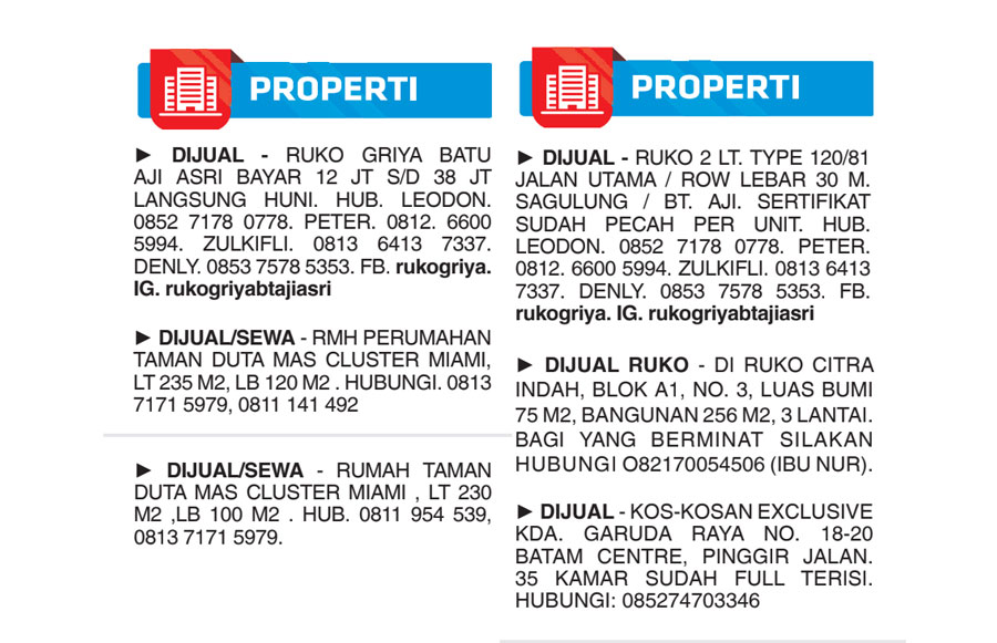 Info Kota Yang Cari Properti Merapat di Sini Editor: Putut ATP Kamis, 6 Jul 2023 - 11:49 WIB Bagikan WhatsAppTelegramLINEFacebookTwitter Berita Terkait Kawasan Komersial dengan Fasilitas Ikonik, Tana Group Pasarkan Perumahan Konsep Urban Info Kota Minggu, 3 Agu 2025 - 14:12 WIB Tana Group Gandeng AREBI Pasarkan AURUM, Urban Hub 24/7 Pertama di Batam Info Kota Minggu, 3 Agu 2025 - 13:11 WIB Tana Group Resmikan Aurum Lounge di One Batam Mall Info Kota Rabu, 11 Jun 2025 - 15:07 WIB Iklan terbit di Harian Batam Pos 6 Juli 2023 Bagikan WhatsAppTelegramLINEFacebookTwitter SALAM RAMADAN Kebab Shawarma Berpadu dengan Jajan Pasar di “A Wishful Ramadan” ARTOTEL Batam Sabtu, 21 Feb 2026 - 11:50 WIB Buka Puasa Sambil Nikmati Sunset, Ini 5 Tempat Favorit di Batam Jumat, 20 Feb 2026 - 15:33 WIB Surga Kuliner Ramadan! 4 Bazar Takjil di Batam yang Wajib Dicoba Kamis, 19 Feb 2026 - 16:03 WIB